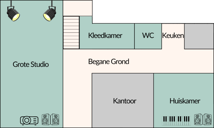 Ondanks de naam is de Kleine Studio ideaal om te boeken voor de ruimtelijke indeling van de studio. Zo is de studio 7 meter bij 6,60 meter en heeft de ruimte een plafond op 4 meter hoogte.